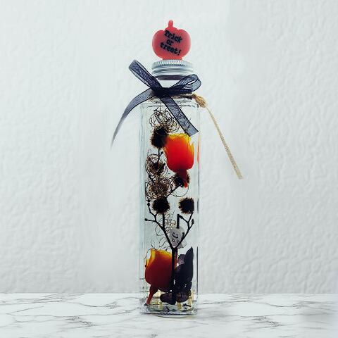 このハーバリウムは手入れが簡単で、長く楽しむことができます。ハロウィンの季節にぴったりのアクセントとして、また一年を通じてお部屋を彩る特別な飾りとして、Halloweenハーバリウムをお楽しみください。不思議な魅力と季節の魔法が、あなたの日常を彩ります。